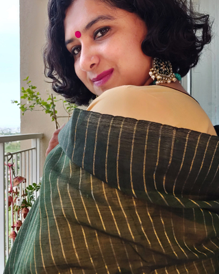 Bottle Green Khadi-Cotton handloom sari with golden zari stripes weaved elegantly.