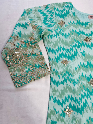 Fabric : Georgette base Color : Green Length : 47 Inch Work : Sequin Stitching Type : Fully Stitched Wash care: First time Dry Wash then normal wash Actual product colour may vary due to brightness & camera quality of different devices.