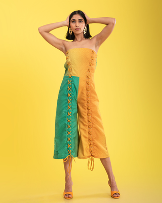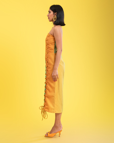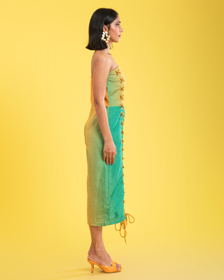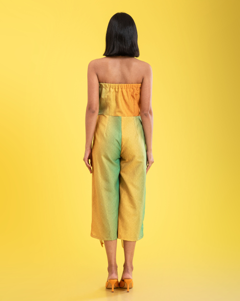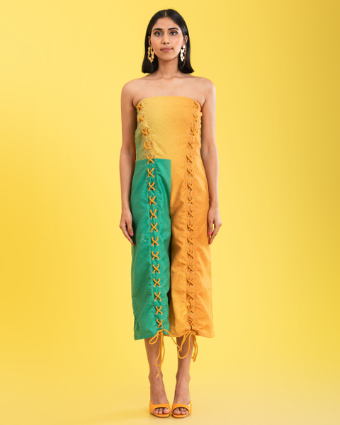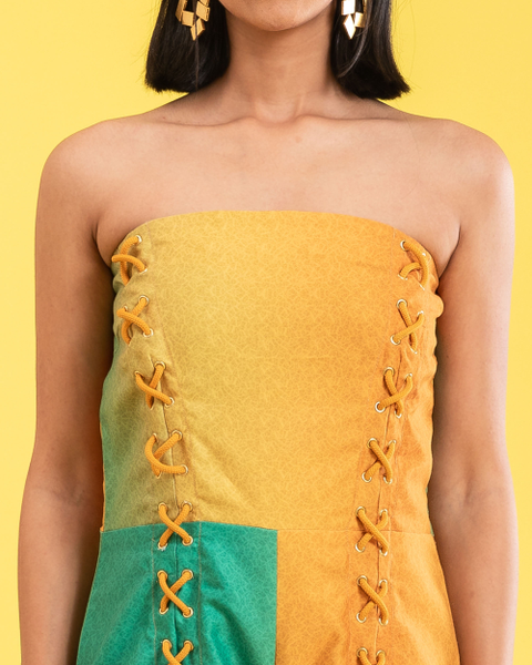 Women green and yellow colour, OCD print viscose tube jumpsuit, stylized with lace and eyelets detailing