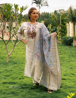 Grey chanderi silk 3 piece salwar suit with embroidery yoke work and banarasi dupatta.