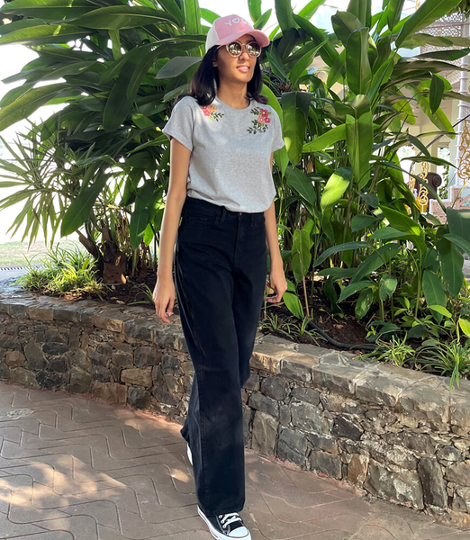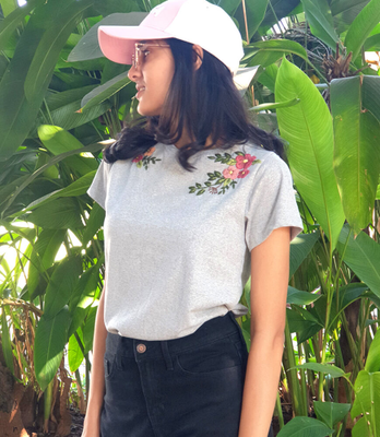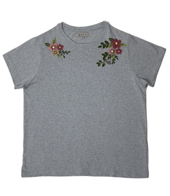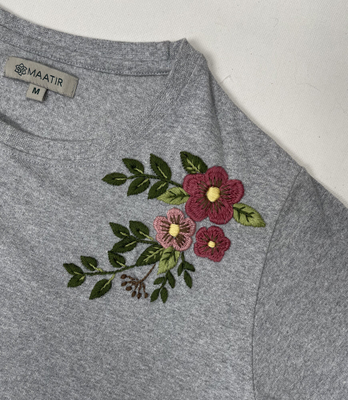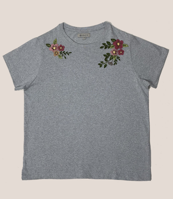 Express your love for hand embroidery with this beautifully embroidered grey t-shirt. Pastel florals in cotton threads in florals and add an old world charm to your look. The fabric is soft and the drape is great and the neutral pastel shades allow you to wear this with a wide range of bottoms.