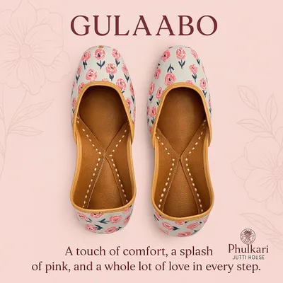 Radiating the charm of blooming roses, Gulaabo is a celebration of grace and femininity. Crafted in a soft pink hue with pastel base, this jutti captures the essence of Indian craftsmanship while ensuring all-day comfort.