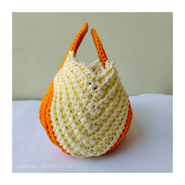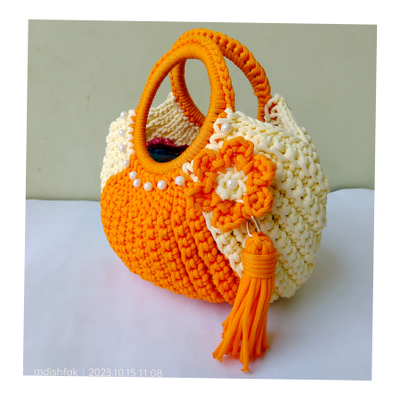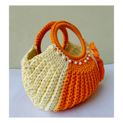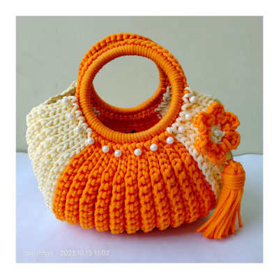 • Features - Crochet Halfmoon Handbags Saffron and Off white colour Handmade Cord Material Size - Length 30 cm , breadth 33 cm