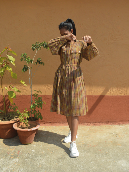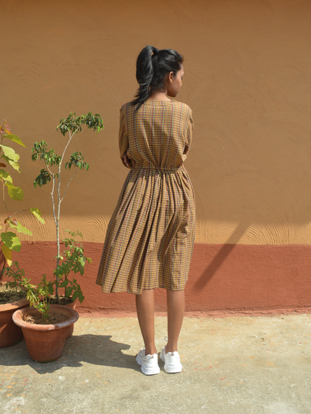 This plain woven cotten dress is made of jharkhand handloom textile, handwoven by Jharkhand bunkar community. edgy, modern and rooted, this checkered dress is prefect to wear for your holidays.