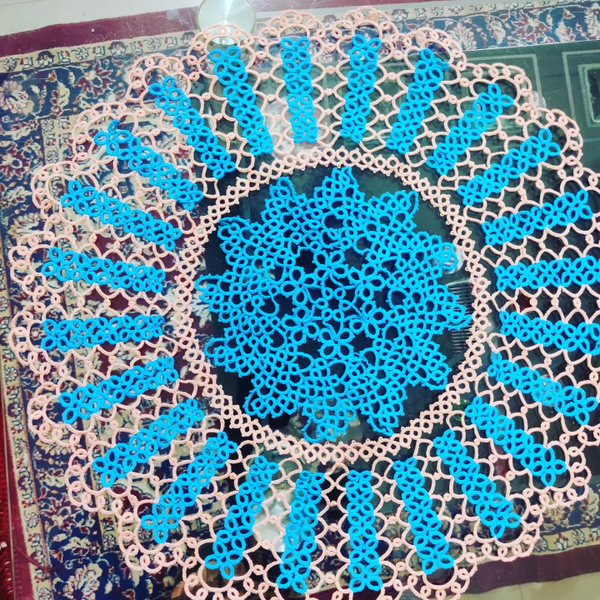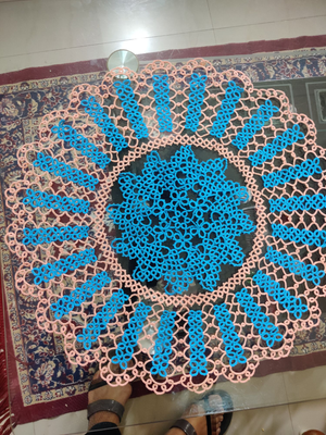 This doily represents love and care for your living area.I used size 20 Doli threads and made with the help of a shuttle, in sky blue and peach colours.The dia of this doily is 40 cms. Only one piece available. This exclusive piece can be used as a wall hanging or as a table piece.