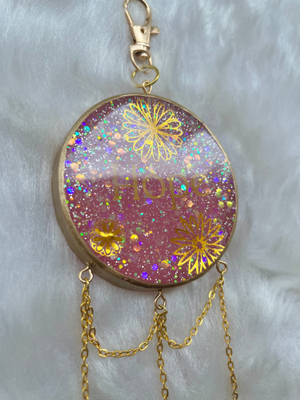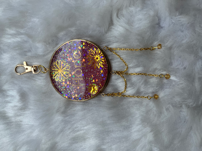 This keychain is made with resin and glitter and it glows in the dark. It has a lobster clasp that can be attached to your bag or your belt loop easily.