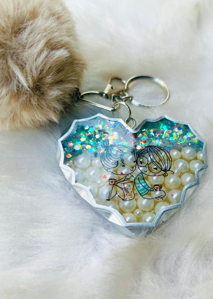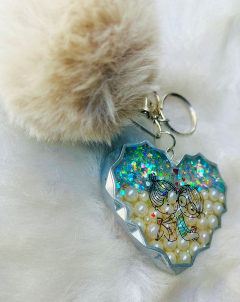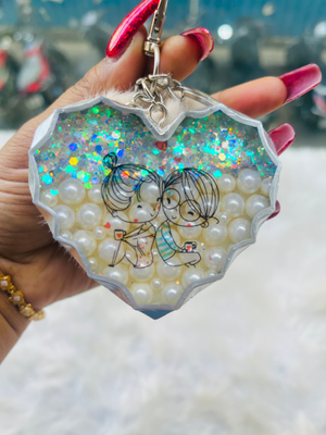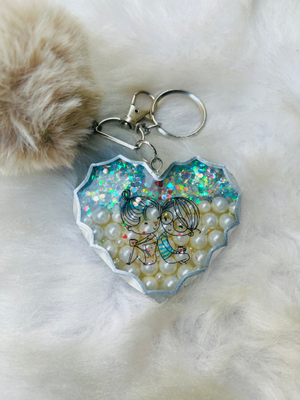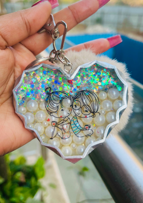 This keychain has pearls and chunky glitter embedded in the resin, it also comes with a fur pom pom which gives it a super cute look. The keychain also has a cute couple picture which makes it a perfect gift for Valentine's day.