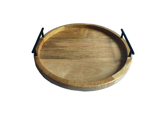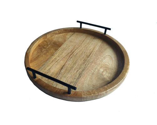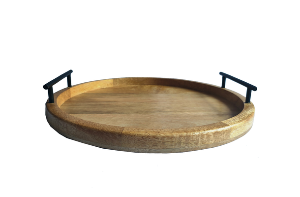 Handmade Wooden Round Serving Tray | Metal Handle Natural Finish