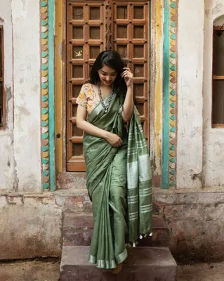 Linen sarees fit every season and occasion. Beauty of Linen and it subtle shimmer of Dull silver Border makes it a "must have" for most occasions or everyday wear.