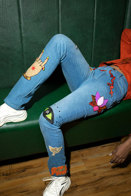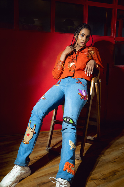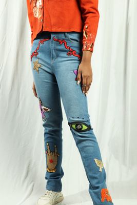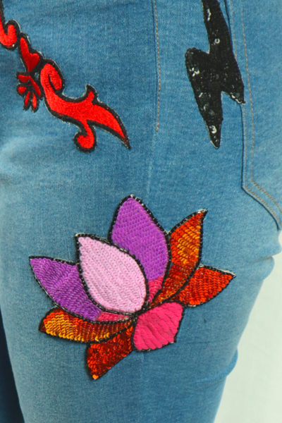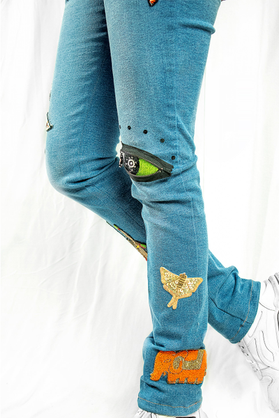 Description: Eccentric Indian motifs hand embroidered with colourful beads and sequins over jeans making it a quintessential and cool statement wear.