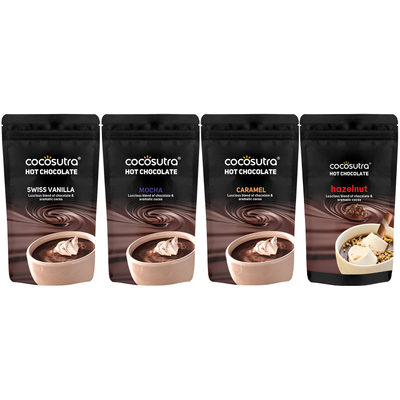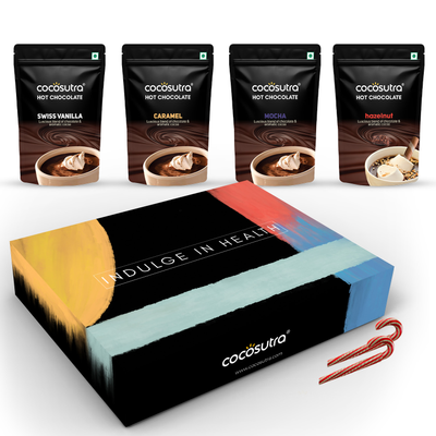 Gift your loved one this Hot Chocolate Celebration Hamper! There is no better way to pass on a hug in a mug. 4 luscious flavors of drinking chocolate, and 2 tasty candy-canes to spread love and JOY! (Each Hot Chocolate Mix Pack is of 100 g)