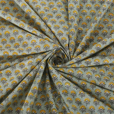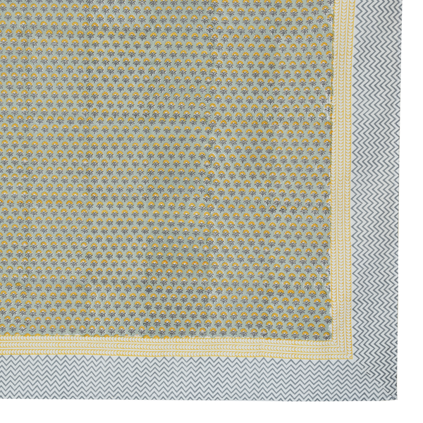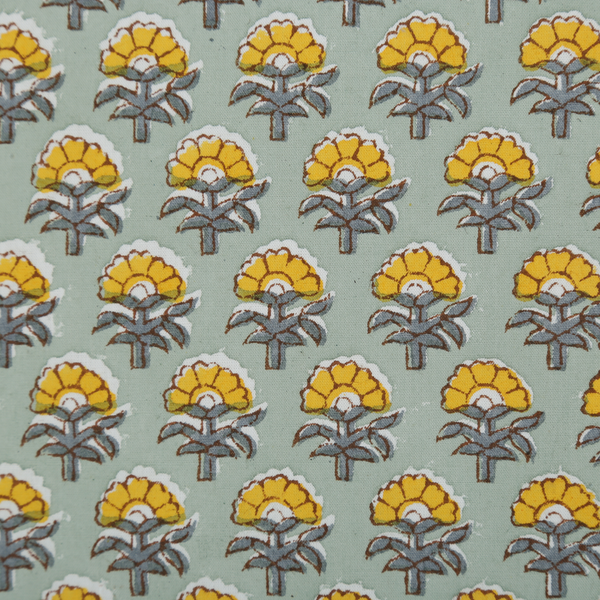 Indigenous Handicrafts Yellow Small Motif Hand Block Printed Green Percale Cotton Double King Bedsheet