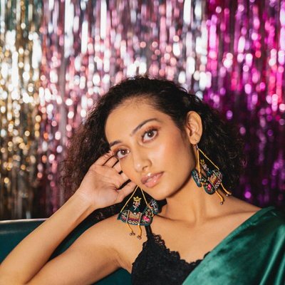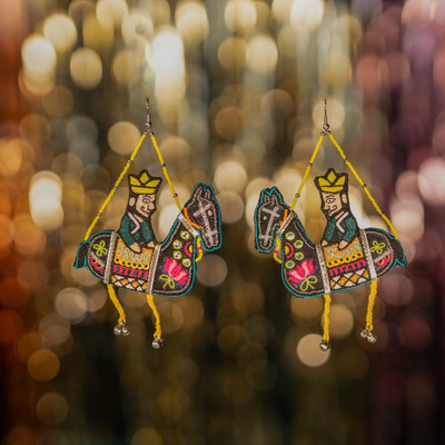 Handmade and hand embroidered earrings with our unique and intricately designed Puppet horse, detailed with beads. Provided with a hook on top. Light weight and easy to carry.