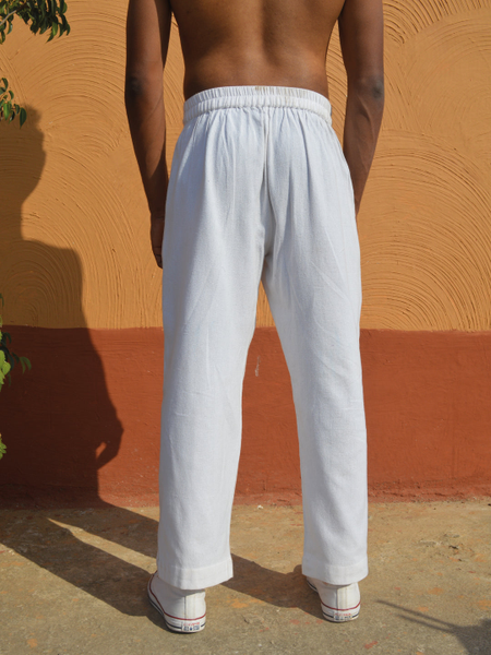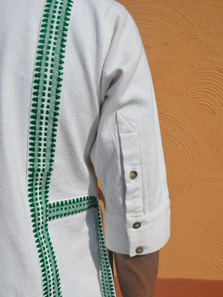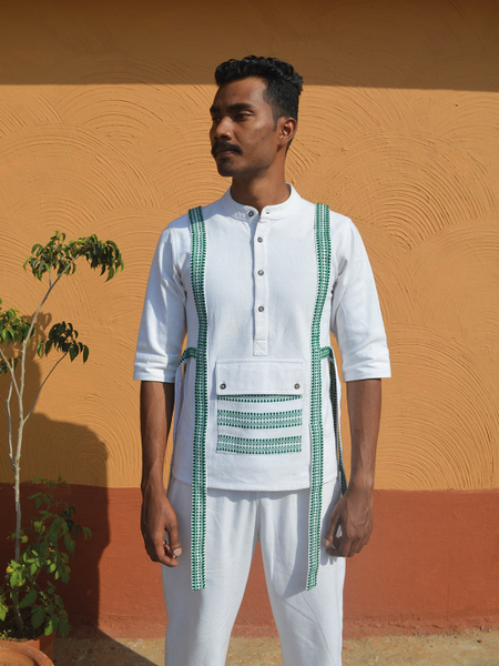 This cotton plain weaved, Unisex half sleeved shirt a straight pajama trouser is made of Jharkhand Tribal Textile Kukhna , originally used as shawl betra luga by various Tribal communities of Jharkhand.