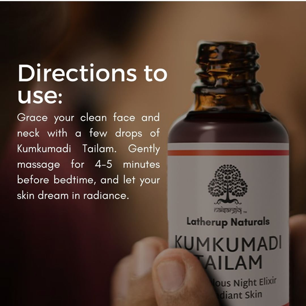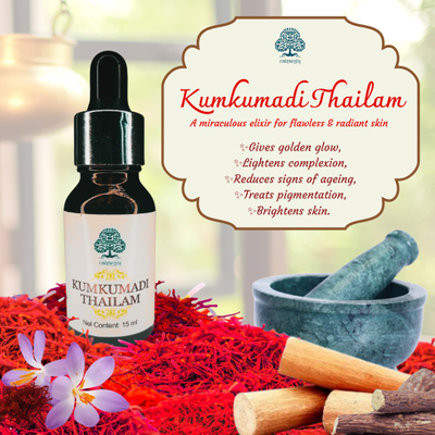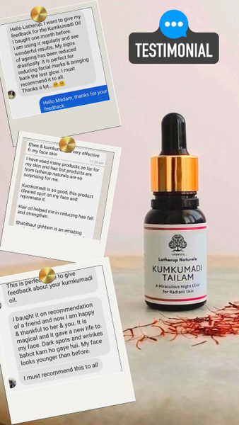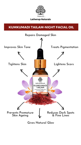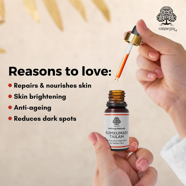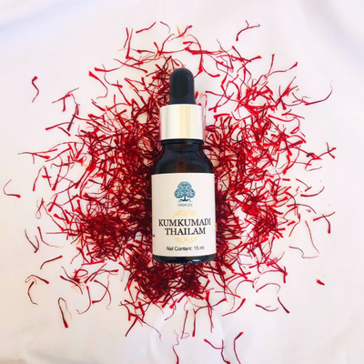 Kumkumadi thailam is considered as the secret of ancient Indian beauty. Usage of kumkumadi thailam is prescribed in Ayurveda as a natural elixir for bright and younger looking skin. It can be used by men and women seeking flawless skin. Massage of just a few drops of Kumkumadi on your face & neck can do miracles even in few applications. It penetrates deep inside, heals and repairs damaged skin cells, thus cures various skin ailments. Naisargiq Kumkumadi Tailam is 100% natural and very effective which makes it better than any other skin care products that are laden with harmful chemicals. Kumkuma means saffron / Kesar which is the main ingredient of this oil and known for making skin healthy and radiant for centuries.