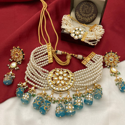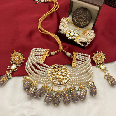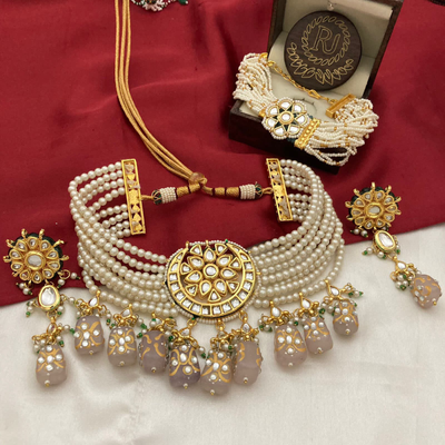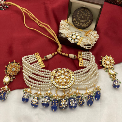 Bollywood Wedding Designer Meena Kundan necklace Set Contains a awesome choker necklace that Fixs the Neck and a Pair of Earrings embedded with Semi-precious Stones like Pearl.