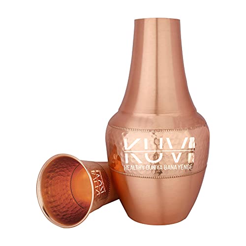 KUVI Pure Copper Hammered-Plain Bed Side Jar Pot Elegant and Stylish Water Bottle with Glass
