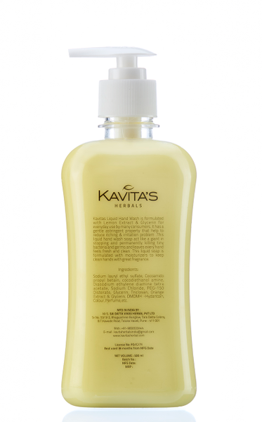 Kavita’s Liquid Hand Wash is formulated with Lemon Extract & Glycerin for everyday use. It has a gentle astringent property that helps reduce itching and. This liquid hand wash soap permanently kills bacteria and leaves your hand clean and fresh. Contains moisturizers for a soft and fragrant feel after use.