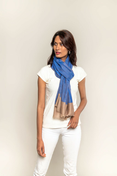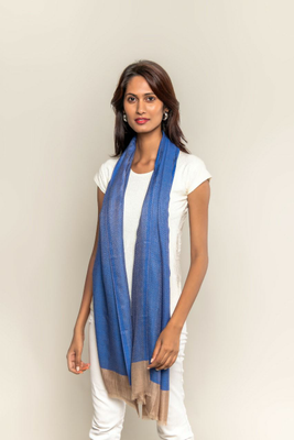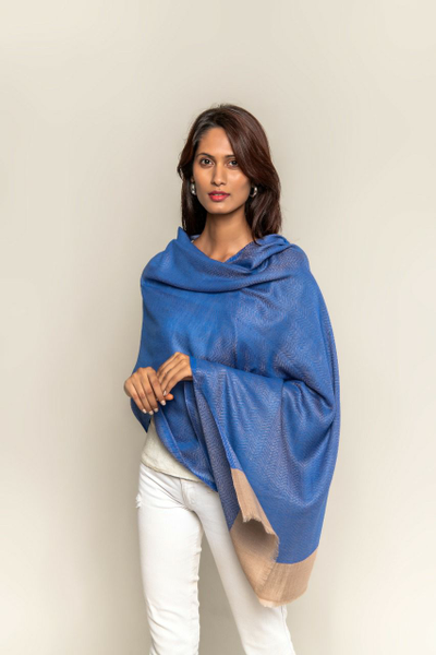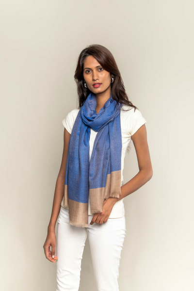 Lightweight Handmade Blended Pashmina, Cashmere Scarf, Stole, Shades Of Blue And Peanut, used as a stole or s...
