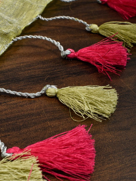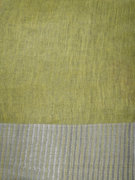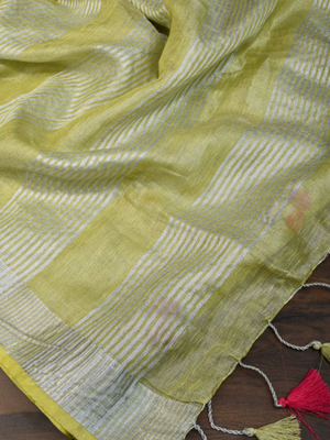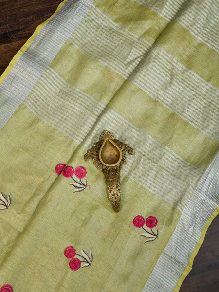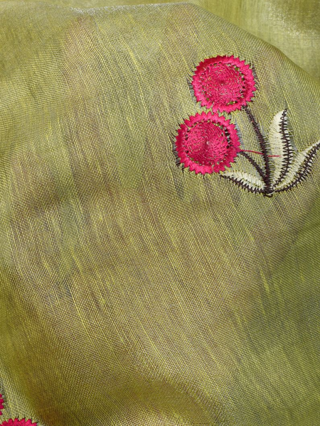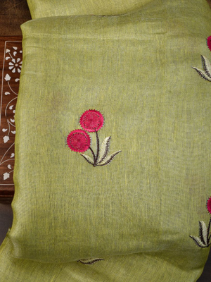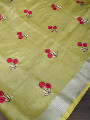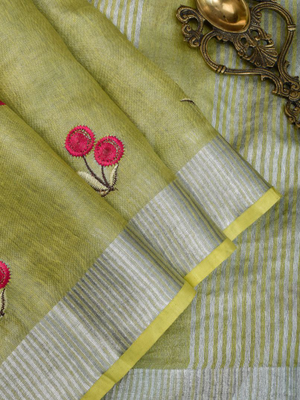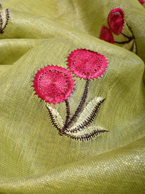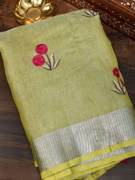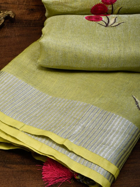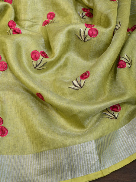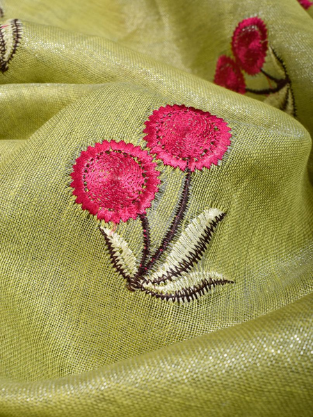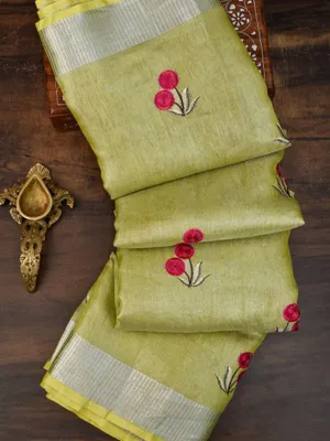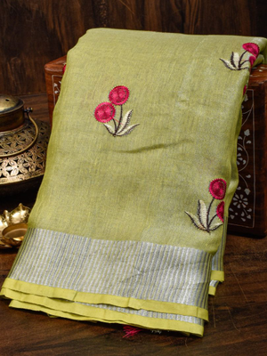 Lime Green Handwoven Tissue Linen Saree With Floral Embroidery