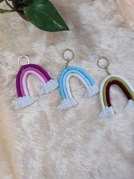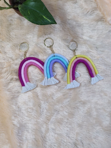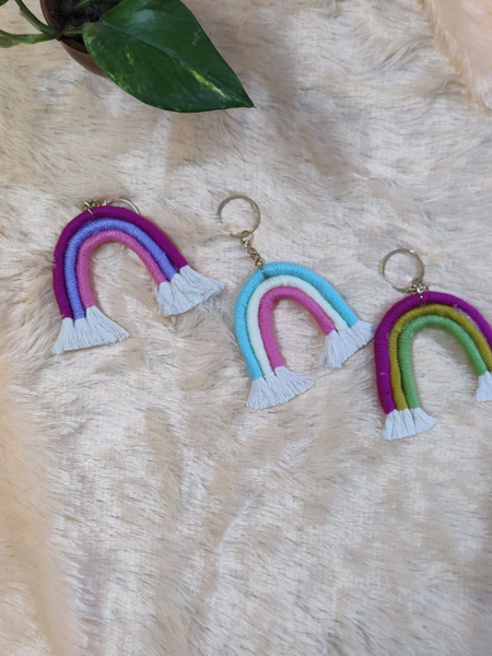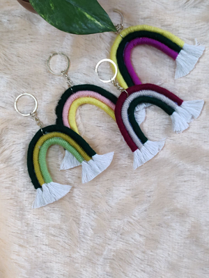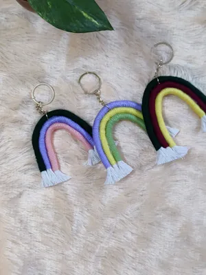 Give a hand-made touch to your keys, totes, and more with our Macrame Rainbow keychain, featuring a key ring that glides in easily. They're completely handmade!