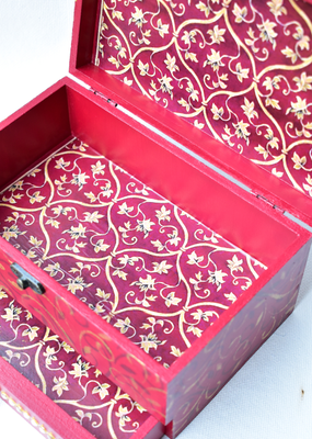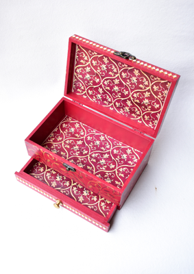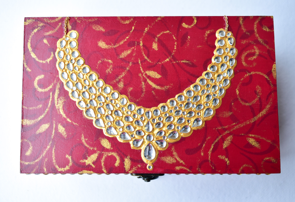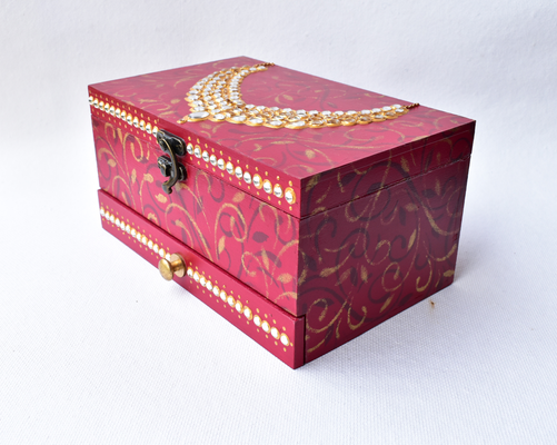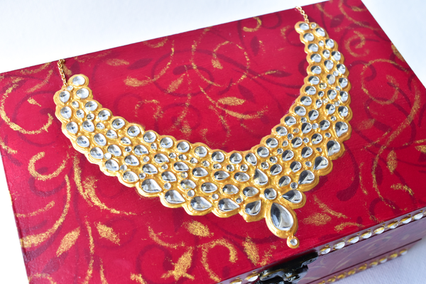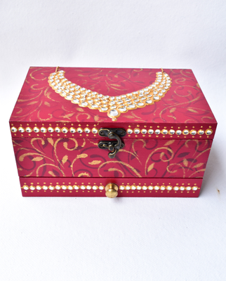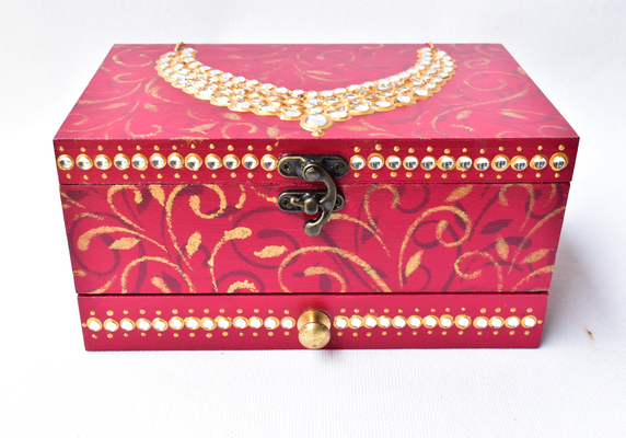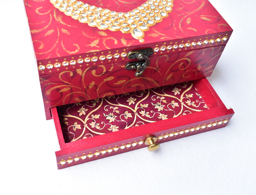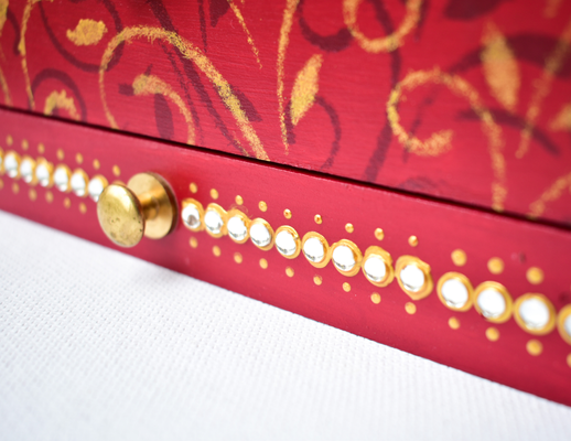 This red wooden MAHARANI JEWELRY BOX looks stunning with a dazzling necklace on the lid. The necklace as well as the front face of the box have been studded with glass "polkis". The box has ornamental designs all over as well in the drawers.