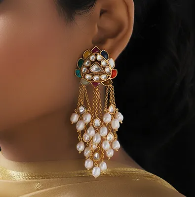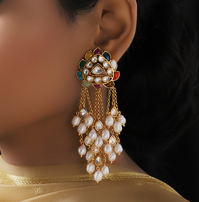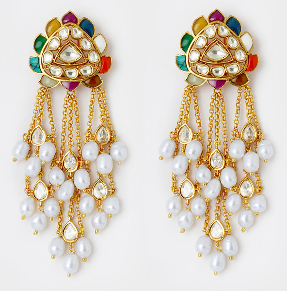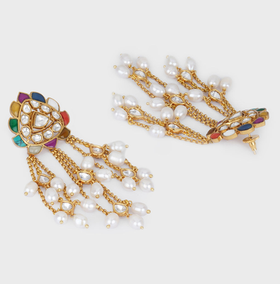 Gilded Navratna Stones As The Top Part Along With Hydro Kundan Polki, Shell Pearls, Gold Pleated Chains And Shell Pearls Is A Masterpiece.
