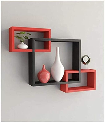 MDF Wall Rack Shelf, Wall Decorative MDF Shelf Set of 3- Brown (Red- Black)