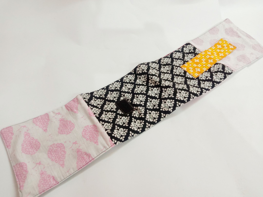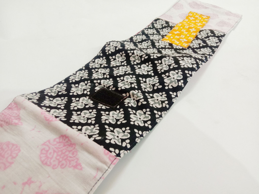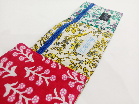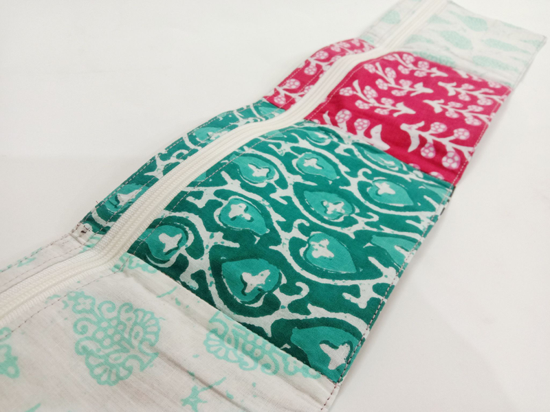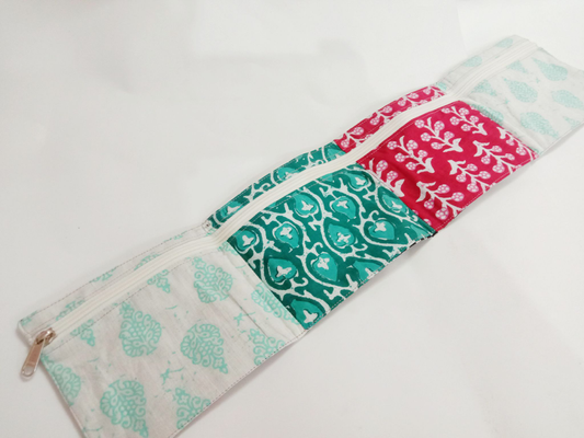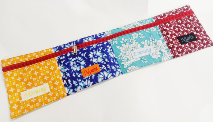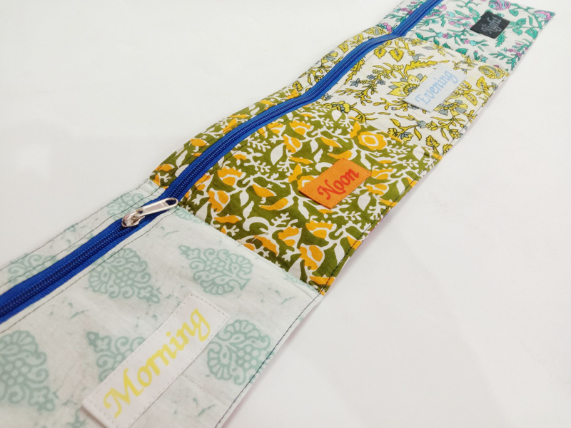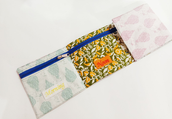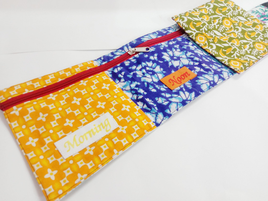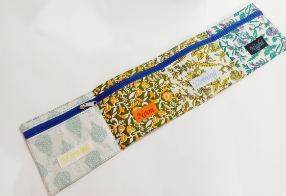 This pouch is made from 100% cotton fabric and has one long zip going through all the pockets for easy usage. Rather than using plastic boxes to organize your daily medicines , this pouch is a sustainable option and Eco friendly option to do so.