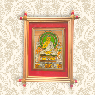 The painting is all about Budha and his followers. • This is a hand printed paintings on the dried palm leaves. This painting is known as pattachitra style of painting which is 2500 years old and belongs to Odisha, India