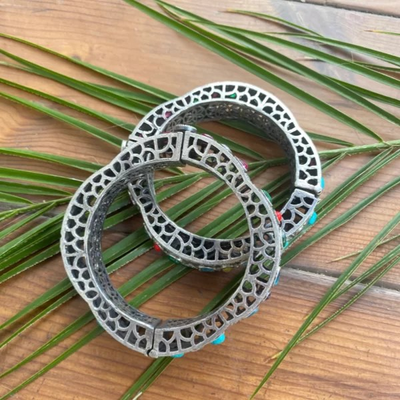 Multi-colour Oxidised Kada is a must-have piece in your collection. These pieces are set in a beautiful silver polish with intricate work. This Kada makes a statement of its own and lends the perfect finishing touch to any look.