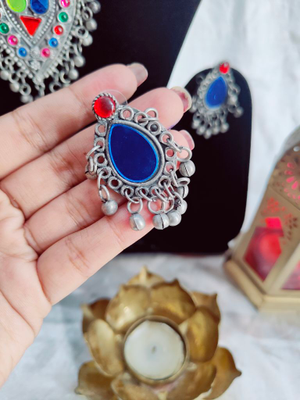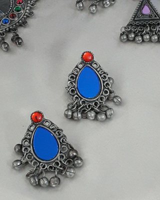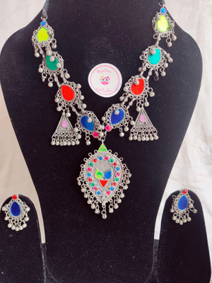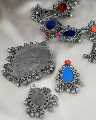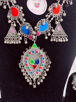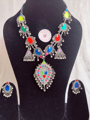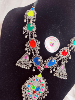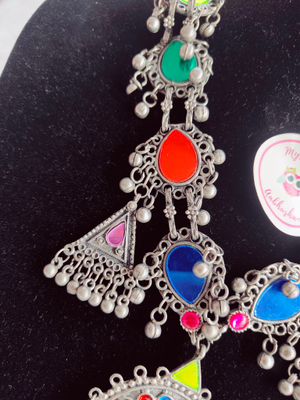 Black metal plated desi afghani jewellery inspired from real Afghan Jewellery. Multicolored mirrors, ghungroos and stones studded desi afghan jewellery is handcrafted with love by the local artisans of Kolkata.
