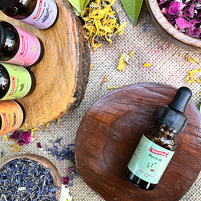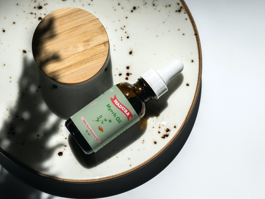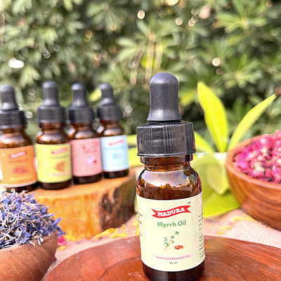 Other uses: Maduras Herbals Myrrh Essential Oil is perfect for aromatherapy, making soaps, facial & hair serum, moisturisers, lotions, body butters, facial gels, foot soaks, roll-on perfumes, air freshners and candle-making BLENDS WITH Carrier Oils like Virgin Coconut Oil, Sesame Oil, Olive Oil, Sweet Almond Oil, Jojoba Oil, etc and it also blends well with other essential oils such as Tea Tree, Peppermint, Mandarin, Cypress, Sandalwood, Frankincense, Juniper, Geranium, Lavender, Patchouli, Pine, Palmarosa, Rose, Rosewood, and Thyme SUITABLE FOR Adults with normal, oily and combination skin. Not for sensitive skin CAUTION Just because Maduras Herbals premium Myrrh Essential Oil is natural, kindly note that it is not suitable for everyone. Please do your own personal research and then proceed cautiously before applying anything directly on your skin and hair. While essential oils are considered safe to use topically, some people may experience allergic reactions. Please dilute it with any carrier oil before applying directly on your skin or hair. DO NOT INGEST ANY ESSENTIAL OIL Buy Premium Grade Myrrh Essential Oil Maduras Herbals premium grade MYRRH ESSENTIAL OIL have so much to offer. Our brand is an industry-leading manufacturer and distributor for premium grade, pure ingredients such as dried flowers, fruit powders, roots, herbs, cold pressed oils, essential oils, soap bases, erc. Maduras Herbals is a brand for consumers and suppliers as well. We supply our authentic herbal ingredients in premium quality to food and cosmetic industries. Our ethically sourced ingredients are prepared with utmost cautious health and safety requirements at every stage of its procurement, manufacturing and distribution to our customers