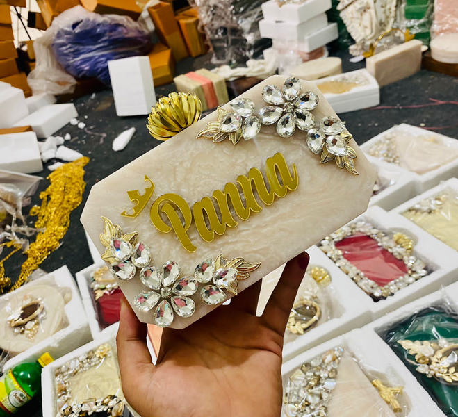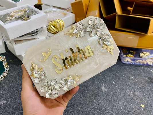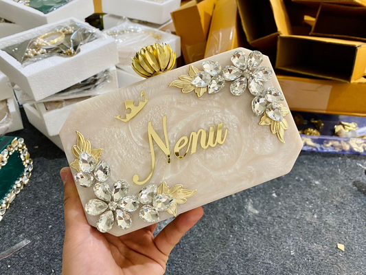 Introducing our unique Name Customised Resin Clutch Bags! These bags are the perfect accessory to add a personal touch to your outfit. Made with high-quality resin material, each clutch bag is customised with your name, making it a one-of-a-kind piece. Our Name Customised Resin Clutch Bags come in a variety of shapes, colors, and patterns, each embellished with crystals, beads, or other materials, adding even more visual interest to the design. With their comfortable hand strap and compact size, these clutch bags are perfect for any occasion. Buy our Name Customised Resin Clutch Bags today and express your individuality in style!