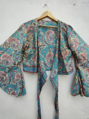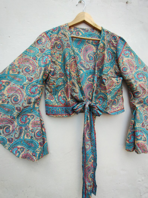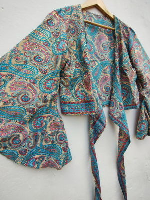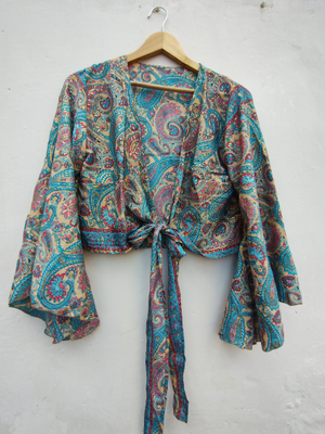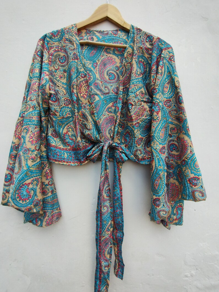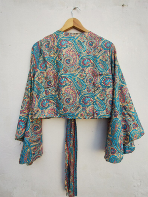 This is fashionable new printed silk wrap top for this summer, easy to wear and comfortable with relaxed bell sleeves crop top tunic dress for women's