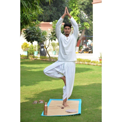 PRODUCT DETAIL- This comfortable khadi yoga vastra in soft khadi of 100 counts is an ideal cloth to perform your yogic routine and even great for meditation purposes. This light weight khadi kurta with 3 wooden buttons in white color is a piece of great comfort to perform yog asanas. The dhyan chakra embroidered on the back of the kurta will motivate you towards your yogic practices.