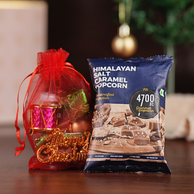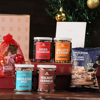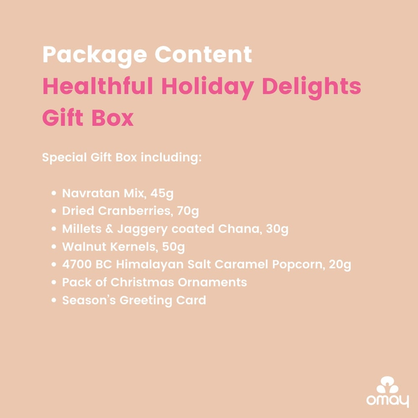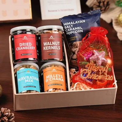 Inclusions: Navratan Mix, 45g; Dried Cranberries, 70g; Millets & Chana - Jaggery coated, 30g; Walnut Kernels, 50g; 4700 BC Himalayan Salt Caramel Popcorn, 20g; Pack of Christmas Ornaments; Season's Greeting Card.