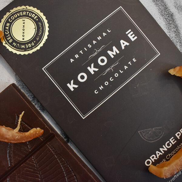 Feel the zing of citrus and let the mesmerizing dark chocolate perform a romantic dance on your taste buds. Kokomaē’s signature candied orange peel chocolate bar is always a treat.