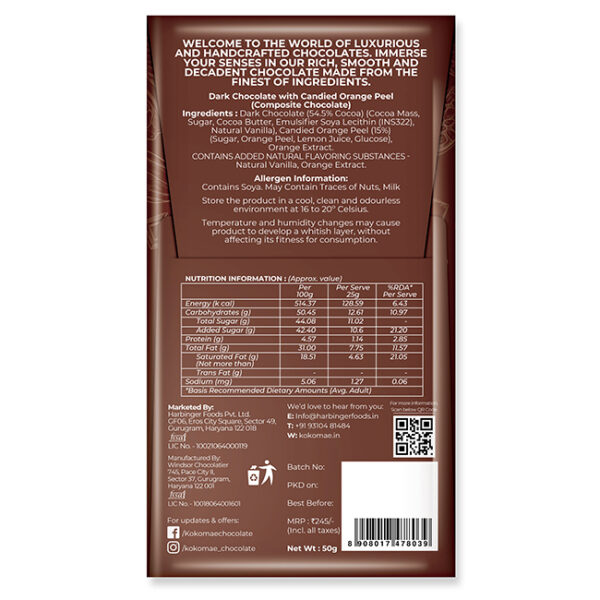 • Ingredients - Dark Chocolate, Cocoa Butter, Emulsifier Soya Lecinthin, Candied Orange Peel, Orange Extract