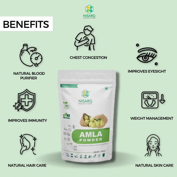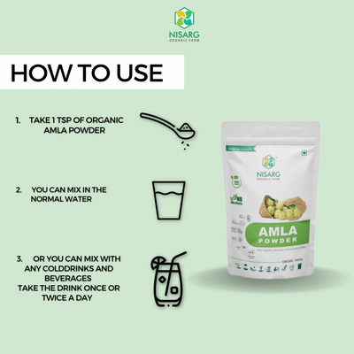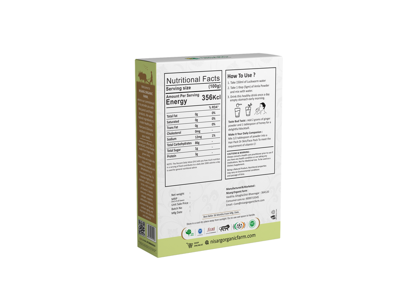 Nisarg Organic Amla Powder is an ideal source of calcium, iron, and protein. It also contains dietary fibre, potassium, and other essential nutrients.Each teaspoon of Organic Amla Powder has just 8 calories- making it a great choice for a healthier lifestyle. Organic Amla Powder is a great source of fibre and antioxidants, which helps increase your body’s red blood cell count and helps maintain new tissues. It can also help boost your immunity and provide beneficial antioxidants. Make the switch to Organic Amla Powder from nisarg Organic for a healthier you!