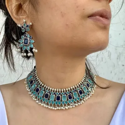 Oxidised Silver Plated Handcrafted Blue Stone Necklace Set
