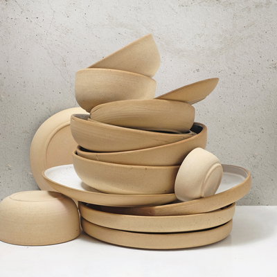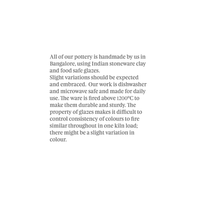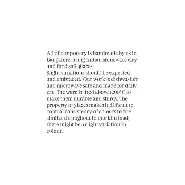 The pasta bowl is more versatile than the name suggests. Technically a bowl, you don’t always have to treat it like one; go ahead and use them for mains. And its in-between size makes it suitable for large entrées and mains alike. If you need one piece to start your collection, make it this one. Every piece features our naked clay body; an ode to the earth's natural elements. Each piece is handmade and one of a kind. Every fold of clay, every mark that's left behind is an imprint of the hands that created it. Glaze colours might vary slightly from the image.