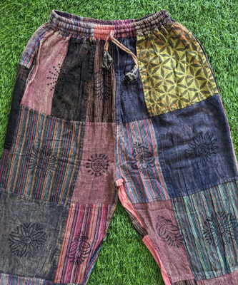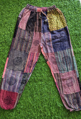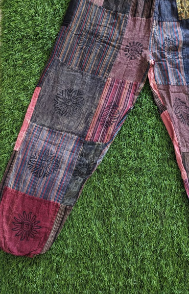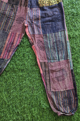 Patched Boho Pants made up of 30-40 colored Cotton cloth patches stitched together with unique Mudhras hand block printed on them. These trousers have elastic waist.