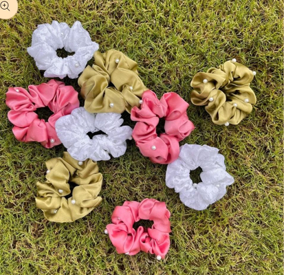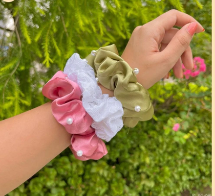 Prevent hair damage and breakage with our comfortable silk-satin and net hair scrunchies. These come in three beautiful colour variants - Pink, White and Green and are embellished with white pearls that make them unique in style.