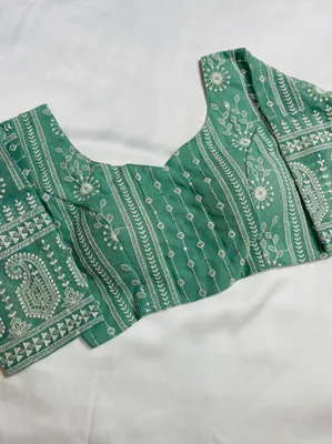 Fabric : Machine Chikankari on georgette base ( Look a like, machine embroidery work) Color : Basil Green Stitching Type : Fully Stitched Work : Sequin Cups Type: Padded Sleeves: Half Sleeves Neckline : V neck Wash care: Dry: Wash Note : Actual product colour may vary due to brightness and camera quality of different devices.
