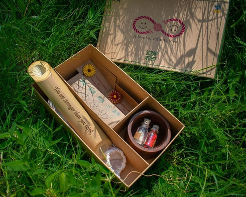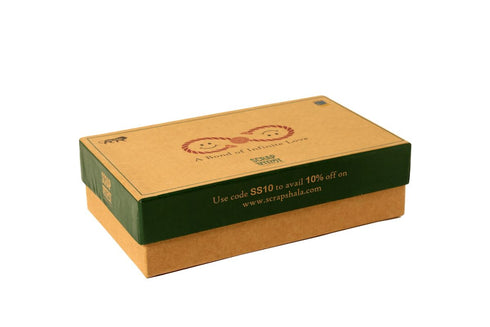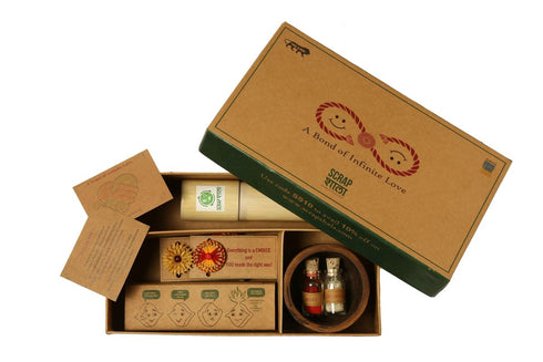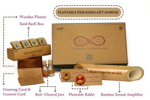 This beautifully curated gift hamper is designed to make your loved ones feel happy, special and surprised. Bamboo Speaker cum mobile holder is the gift item included in this hamper. The sunshine Rakhi is designed to bring hope and positivity. The Togetherness Rakhi is designed to make your bond stronger. It is handcrafted on 100% natural cork base, wheat grains, wooden beads, cotton mauli, plant seeds and recycled paper. This Plantable Rakhi that can be grown into a plant after the festival visions to help you create a greener future and a lifetime memory for your loved ones. · Theme: The theme for Rakshabandhan 2022 by Scrapshala is gender equality. All our Rakhis are gender neutral in design and can be grown into a plant to signify an infinite bond between any two human beings. · Content: 2 Plantable Rakhis, 1 Rakhi Instruction Card Tag, 1 Greeting Card, 1 Thankyou Card, Roli-Chawal, 1 Planter, 1 Seed Barfi Box, 1 Travel Kit/1 Natural Sound Amplifier. · Eco-friendly Packaging: The entire packaging is made from kraft paper is uncoated and 100% recyclable. · Know your artisan: This Rakhi is handcrafted by Mrs Geeta Singh of Varanasi. · Impact: This Rakshabandhan, you have directly supported livelihood of a local artisan and made Rakhi festival a greener and plastic-free celebration. · Pre order: Please make your purchase latest by 4th Aug 2022 to ensure a timely delivery before Rakshanbandhan 2022 (11th August 2022). · Shipping: Available all over India. For international shipping, write at scrapshala@gmail.com · Return policy: No return/No exchange unless product is received in a damaged condition. Share the pictures of damaged product at scrapshala@gmail.com within 24 hours of order delivery for our team to investigate your complaint.