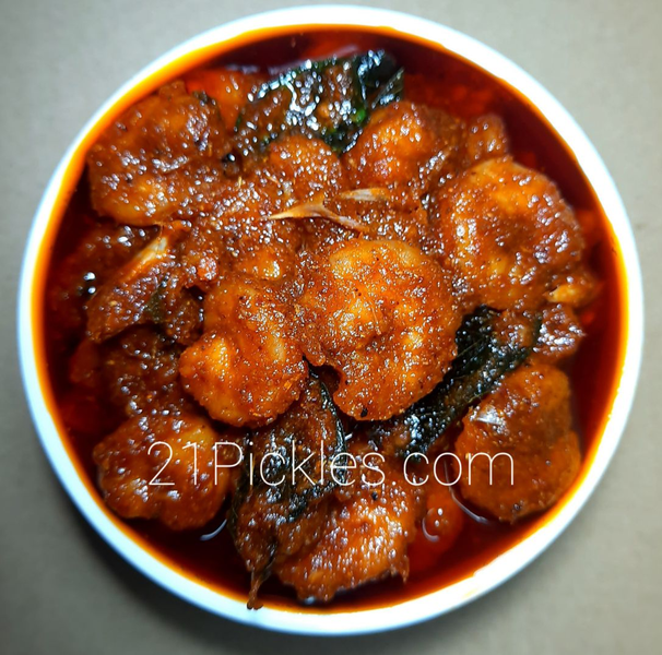 21 Pickles selectively picks the best of prawns from the chosen few aquaculturists across Godavari Districts. Combined with pure unrefined oils, authentic chilli powder and home made garam masala, No Preservatives nor added Colours. .Our Mam chefs are masters on non Veg Pickles preparation and packing. no doubt our prawn pickle will be on repeat mode on your dining table.