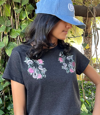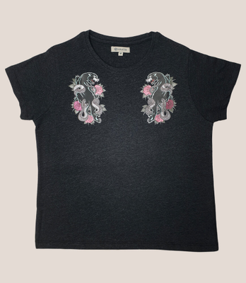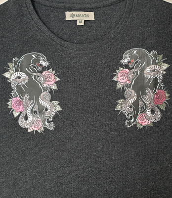Buy this beautiful retro art printed t-shirt for women. Inspired by the leopards of India, this dark charcoal grey fashion tshirt looks great on any color bottoms. This printed leopard t-shirt for women is made with 100% recycled material. The fabric is soft and this souvenir t-shirt will last for years. Buy this retro tattoo art t-shirt has leopard art print on the shoulders.