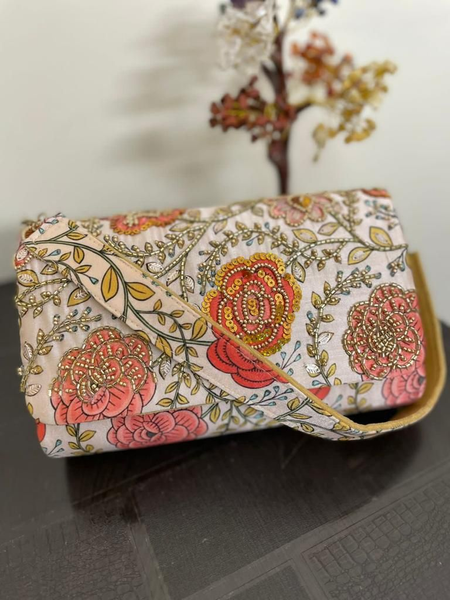 Floral bead work designer embroidery flap handbag.