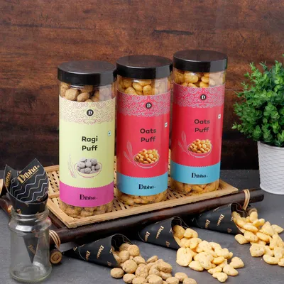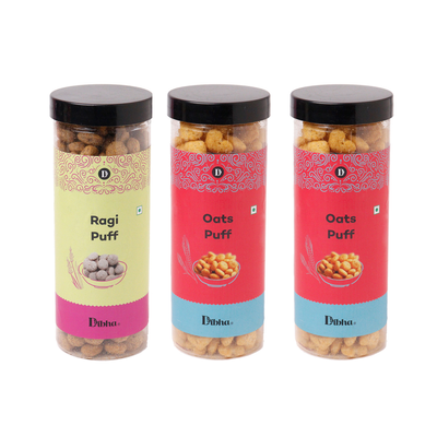 DIBHA - HONEST SNACKING Puffs offer a delightful snacking experience that combines health and taste. This pack includes three 100g bags of puffs - 2 bags of Oats Puff and 1 bag of Ragi Puff, totaling 300g. Made from roasted oats and ragi (finger millet), these 100% vegetarian snacks are gluten-free, cholesterol-free, and free from trans-fat. With a satisfying crunch and delectable flavor, they're a guilt-free choice for all ages. Ready to eat and individually packaged, these puffs provide a nutritious and convenient snack option that doesn't compromise on taste.